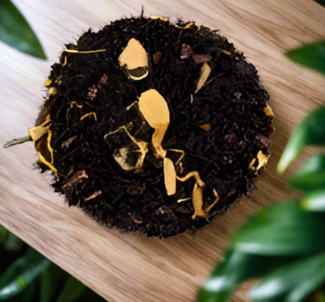 Ingredients: Black Tea Ceylon, cocoa nibs, pear, flavour, almond, pink rosebuds, marigold.